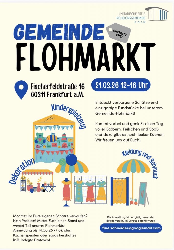 Gemeinde-Flohmarkt: Am Samstag, den 21. März, ab 12.00 Uhr verwandelt sich unsere Weihehalle in einen bunten Umschlagplatz für allerlei Schätze aus zweiter Hand, der Gemeindesaal steht mit der kleinen Spielecke zum Plausch und gemütlichen Beisammensein bei Kaffee und Kuchen bereit und für Kinder ab 3 Jahren wird es auch ein kreatives Angebot im Nebenraum geben. Für die sportlicheren Kids steht natürlich wie immer die Tischtennisplatte und der Tischkicker im Untergeschoss zur Verfügung. Wir freuen uns auf viele interessierte große und kleine Besucherinnen und Besucher, ganz gleich ob zum Stöbern, selbst verkaufen oder einfach nur zum munteren Miteinander in familiärer Atmosphäre – oder alles zusammen! Wer einen Stand mieten möchte, schicke bitte eine E-Mail an fine.schneider[ät]googlemail.com. Die Standmiete beträgt 8.- Euro + Kuchenspende. Anmeldeschluss der 14. März.